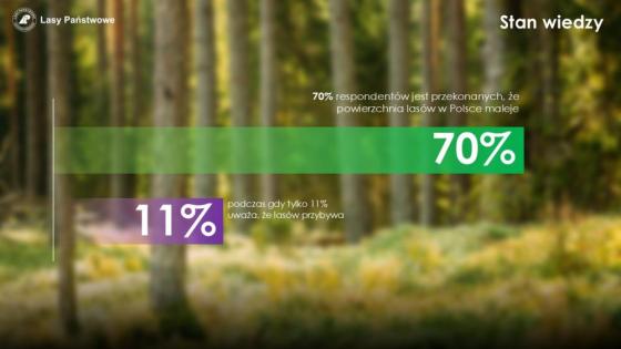 W społeczeństwie wciąż pokutują także mity dotyczące stanu polskich lasów. Aż 70% respondentów jest przekonanych, że powierzchnia lasów w Polsce maleje, podczas gdy tylko 11% uważa, że lasów przybywa. Tymczasem lesistość Polski stale rośnie. Po II wojnie światowej lasy stanowiły 21% powierzchni naszego kraju, dziś jest to już prawie 30%. Tylko w ciągu ostatnich 25 lat powierzchnia lasów w Polsce zwiększyła się o prawie pół miliona hektarów.